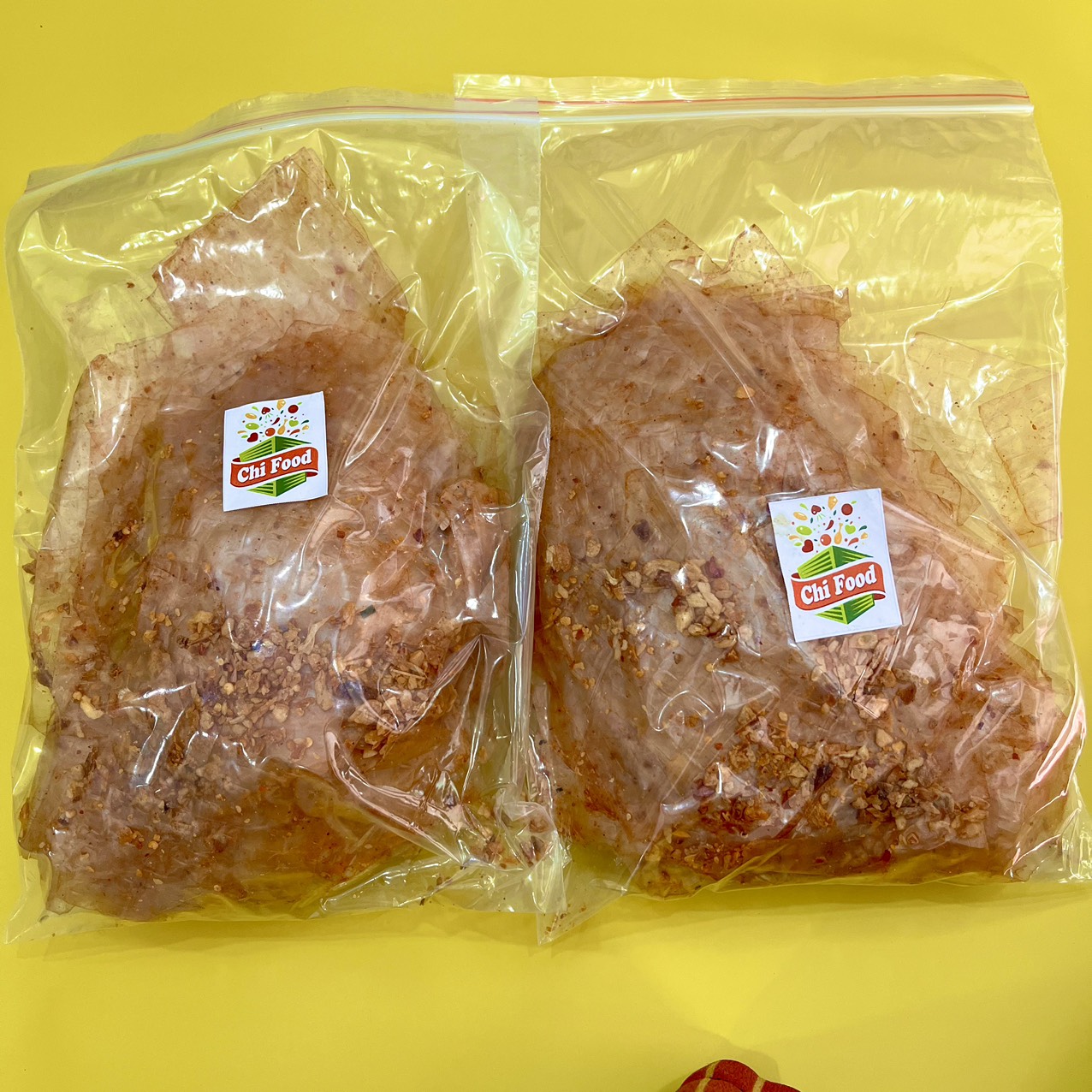 Bánh tráng miếng vuông, muối chay, tỏi phi trộn đều, bánh tráng mềm, vị cay mặn